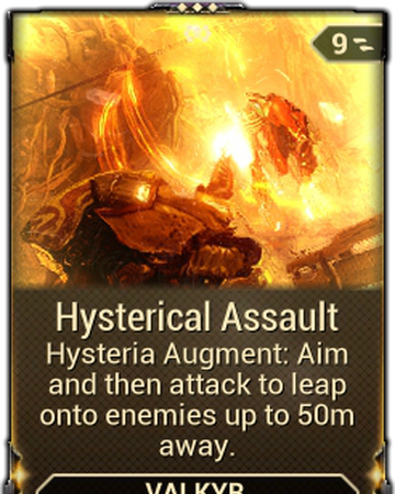 Valkyr is best with Hysteria. She comes with her own set of melee weapons and her skill set is supporting the melee combat style. Her fourth ability should also be complement with Duration mods like Continuity Narrowminded andor Blind Rage.