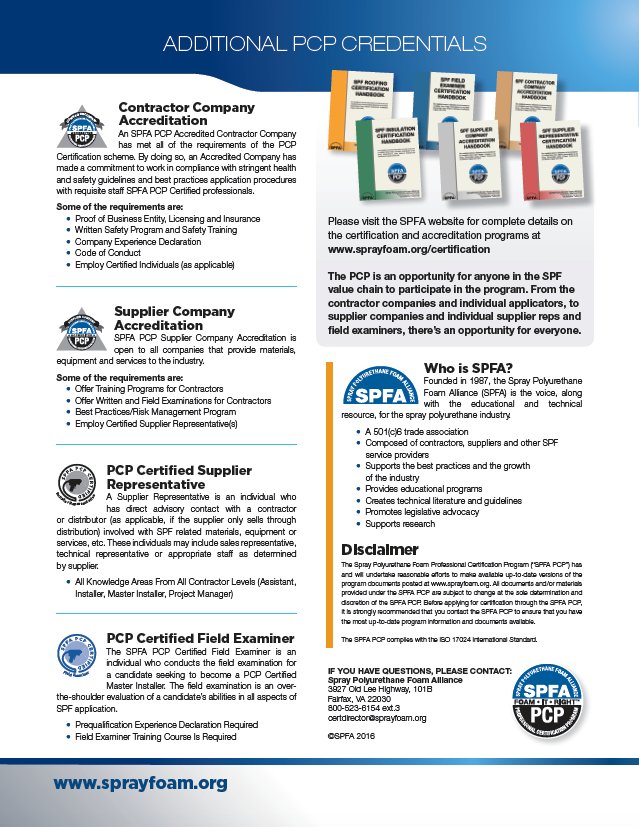 It is intended to provide general information to persons who may handle or apply spray polyurethane foam chemicals. Spray Polyurethane Foam Alliance 11 Hope Rd. Spray Polyurethane Foam Alliance Originally founded as the Urethane Foam Contractors Association UFCA in 1975 In 1987 it became the Polyurethane Foam Contractors Division of the Society of the Plastics Industry SPI Since 2003 it has been an independent trade association for. FIELD EXAMINER The SPFA PCP Certified Field Examiner is the person who conducts the field examination. The Spray Polyurethane Foam Alliance SPFA conducted a life cycle assessment of spray foam insulation. The SPFA hosts the annual Sprayfoam Show Convention Expo the countrys largest event dedicated solely to all things spray polyurethane foam. The Alliance is a 501 c6. The Spray Polyurethane Foam Alliance SPFA has updated the industry-wide LCA Life Cycle Assessment of spray polyurethane foam SPF products. Spray Polyurethane Foam Alliance 4400 Fair Lakes Court Suite 105 Reston Va 22033.